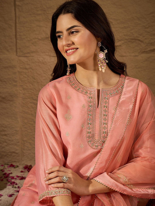 Dhiyona PD Women Floral Woven Design V-Neck Straight Kurta With Trouser & Dupatta