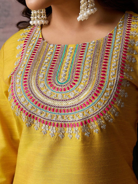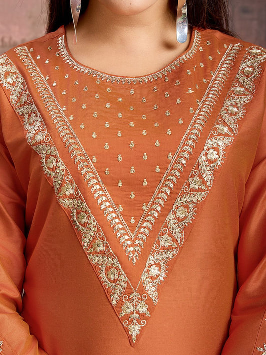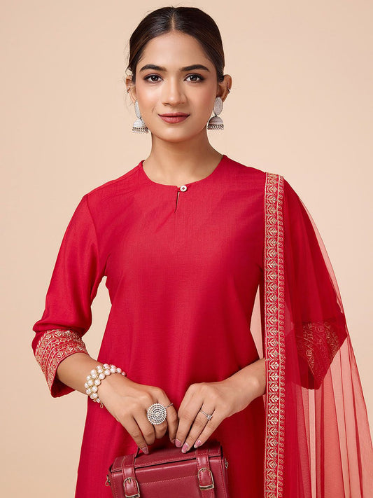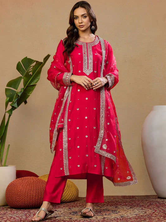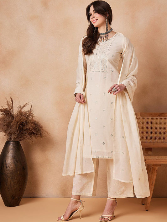 Dhiyona PD Women Sequined Embroidered Round Neck Straight Kurta & Trousers With Dupatta