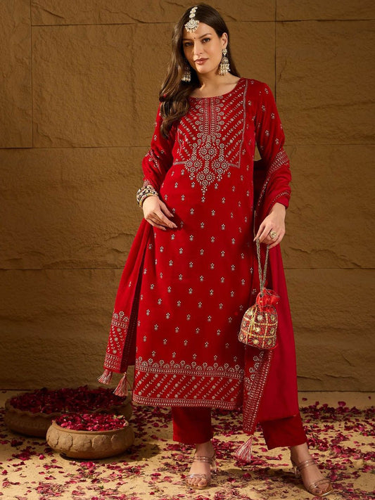 Dhiyona PD Women Embroidered Velvet Straight Kurta With Trousers And Dupatta