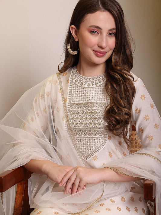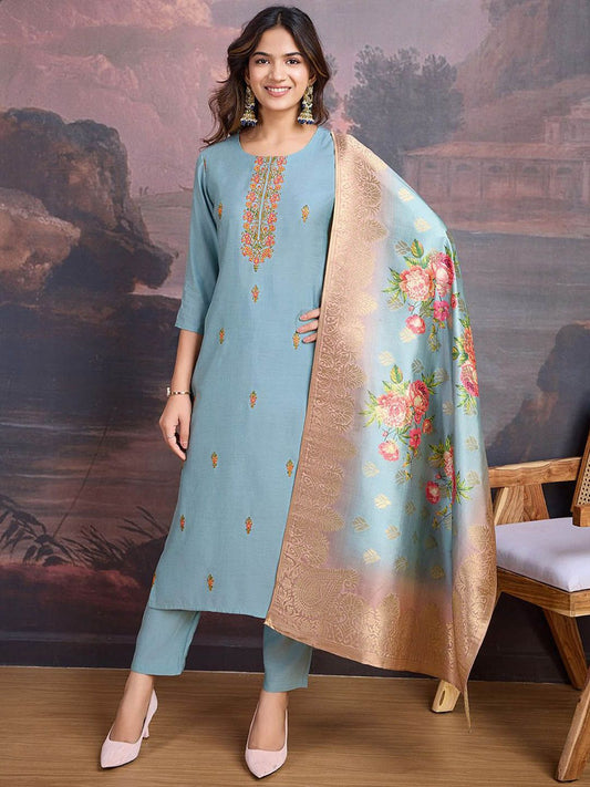 Dhiyona PD Women Floral Embroidered Chanderi Cotton Straight Kurta With Trousers & Dupatta