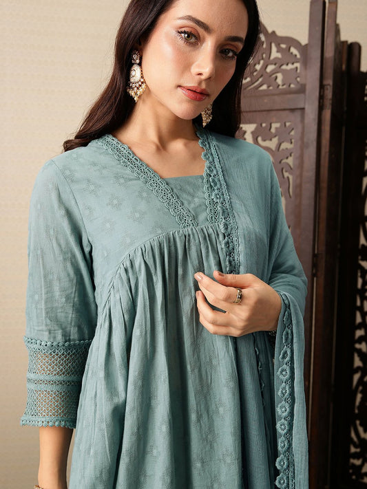 Dhiyona PD Women Floral Embroidered Pure Cotton Jashn A-Line Kurta with Trousers & Dupatta