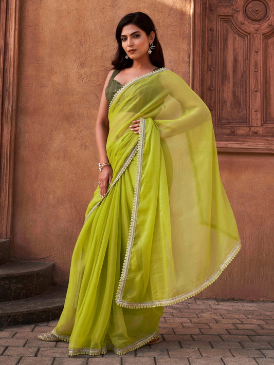 Dhiyona TI Women's Green Shimmer Chiffon Saree with Unstitched Blouse