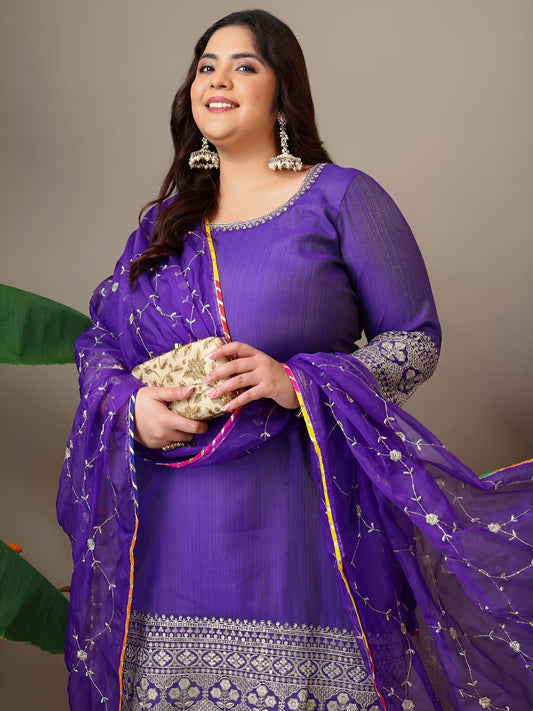 Dhiyona IN Women Plus Size Geometric Foil and Zari Embroidered Kurta Set with Dupatta