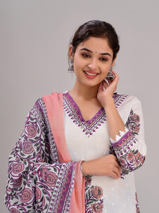 Dhiyona KL Floral Printed V-Neck Straight Kurta With Trousers & Dupatta