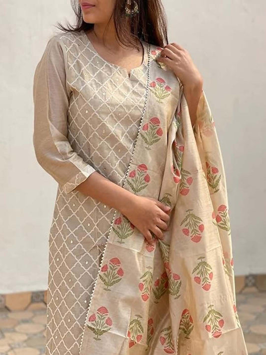 Dhiyona KL Checked Embroidered Notch-Neck Thread Work Straight Kurta With Trousers And Dupatta