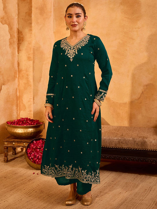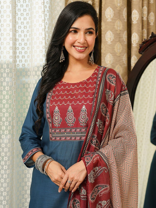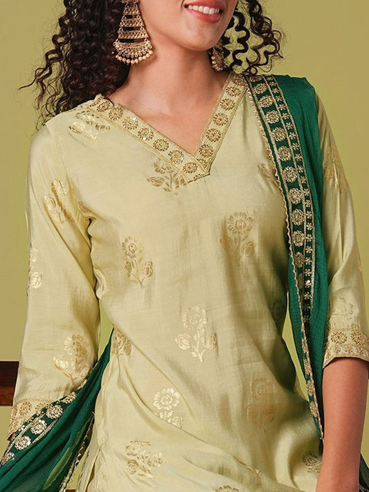 Dhiyona KL Ethnic Motifs Yoke Design Chanderi Silk Straight Kurta & Trouser With Dupatta