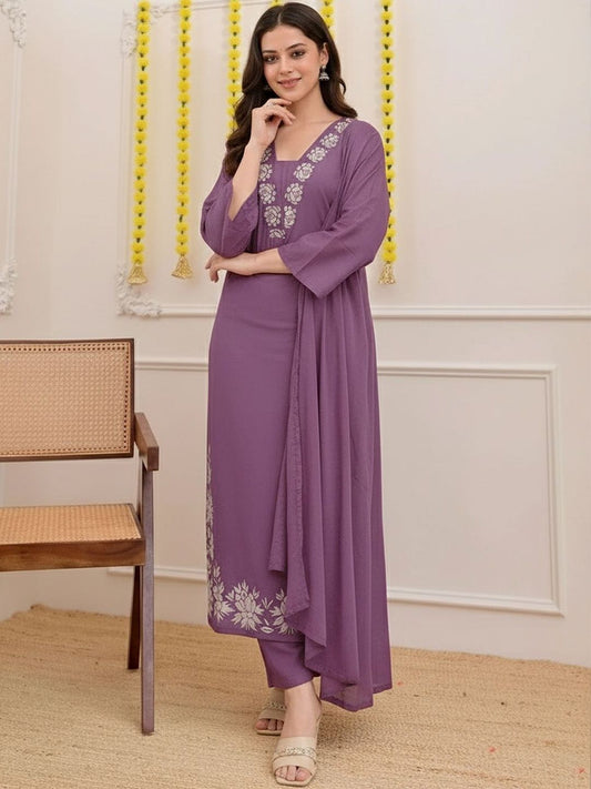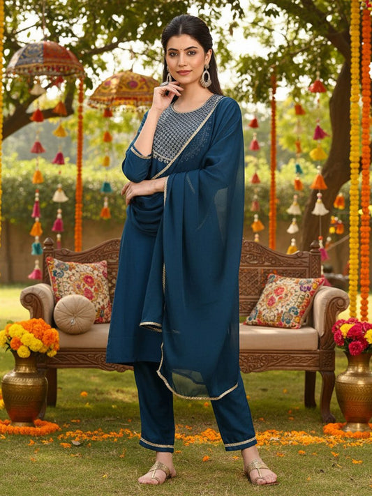 Dhiyona KL Women Embroidered Straight Kurta with Trousers & Dupatta