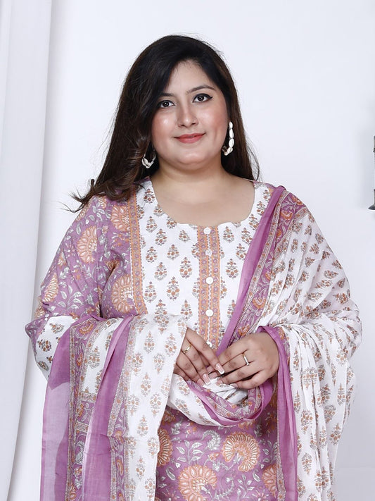 Dhiyona KL Plus Size Floral Printed Pure Cotton Kurta with Trousers & Dupatta