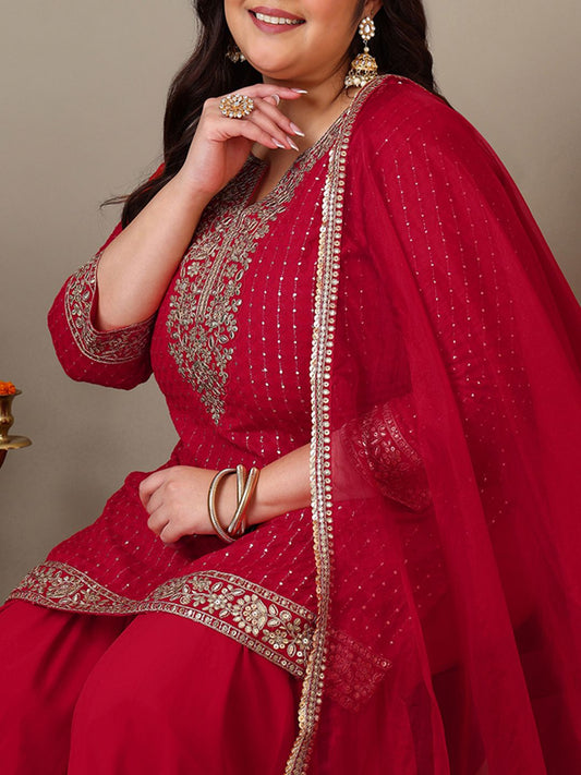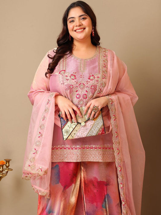Dhiyona IN Plus Size Women Zari Thread Embroidered Crushed Organza Kurta Set with Dupatta