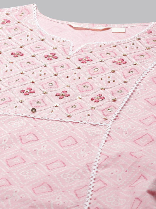 Dhiyona KL Bandhani Printed Sequinned Pure Cotton A-line Kurta With Trousers & Dupatta