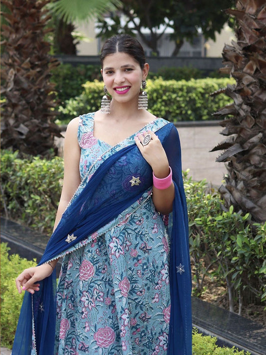 Dhiyona KL Floral Printed Sequinned Sleeveless Anarkali Kurta With Trouser & Dupatta