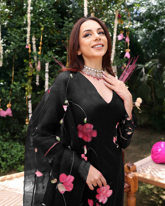 Dhiyona KL V Neck Floral Embroidered Anarkali Kurta With Trousers & Dupatta