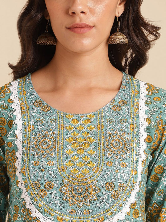 Dhiyona KL Ethnic Motifs Printed Regular Kantha Work Pure Cotton Kurta with Trousers & With