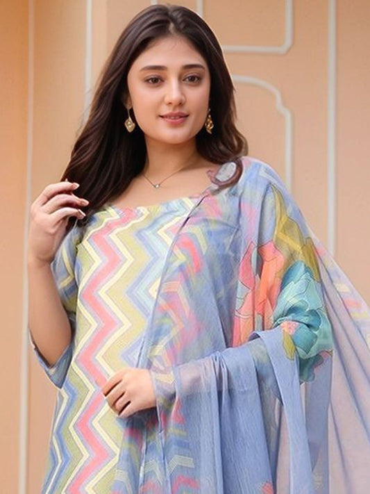 Dhiyona KL Floral Printed V-Neck Straight Kurta with Trouser And Dupatta