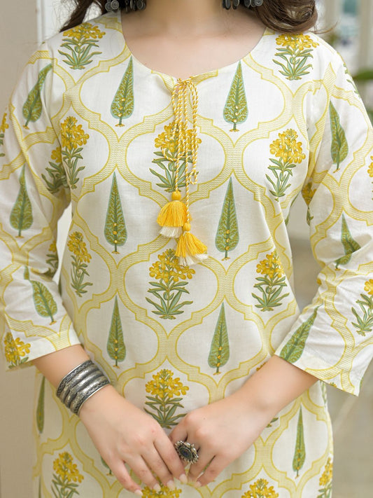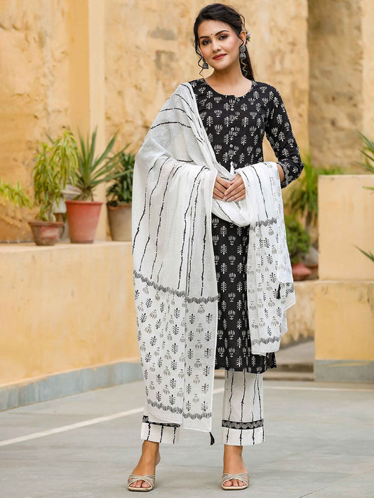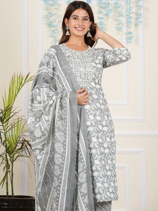 Dhiyona KL Floral Printed Regular Pure Cotton Straight Kurta With Trousers & Dupatta
