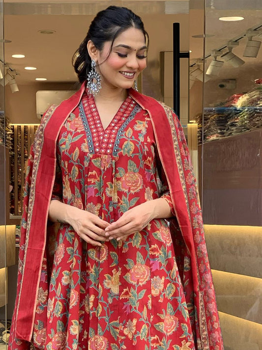 Dhiyona KL Women Floral Printed V-Neck Anarkali Kurta With Palazzos & Dupatta