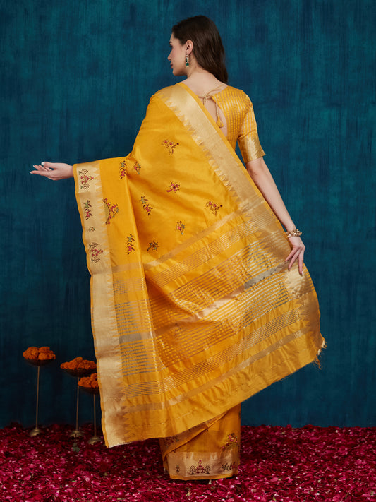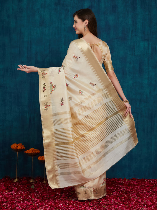 • Dhiyona RV Women's Assam Cotton Silk With Golden Border And Multicolor Thread Embroidered Saree  ( KVD2165 )