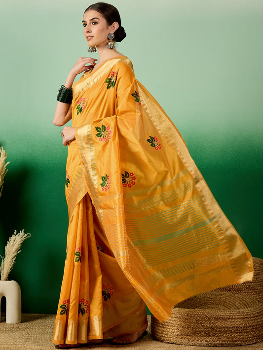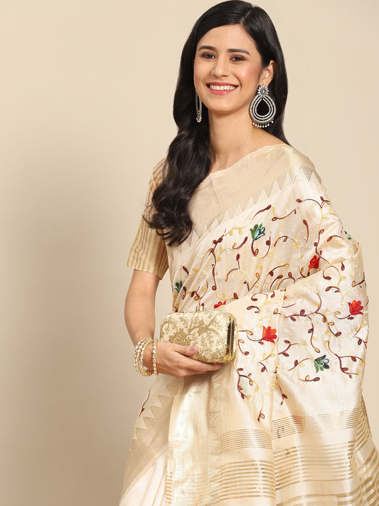 Dhiyona RV Women's Elegant Assam Cotton Silk Saree with Thread Embroidery & Golden Zari Border With Blouse ( KVD1893 )