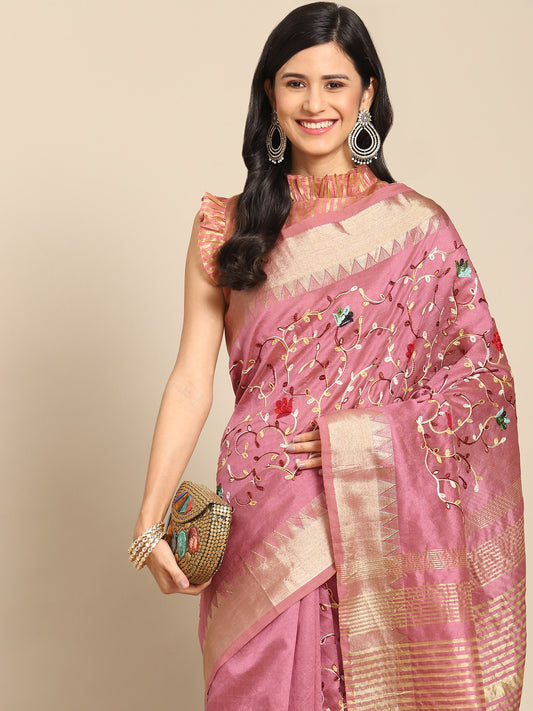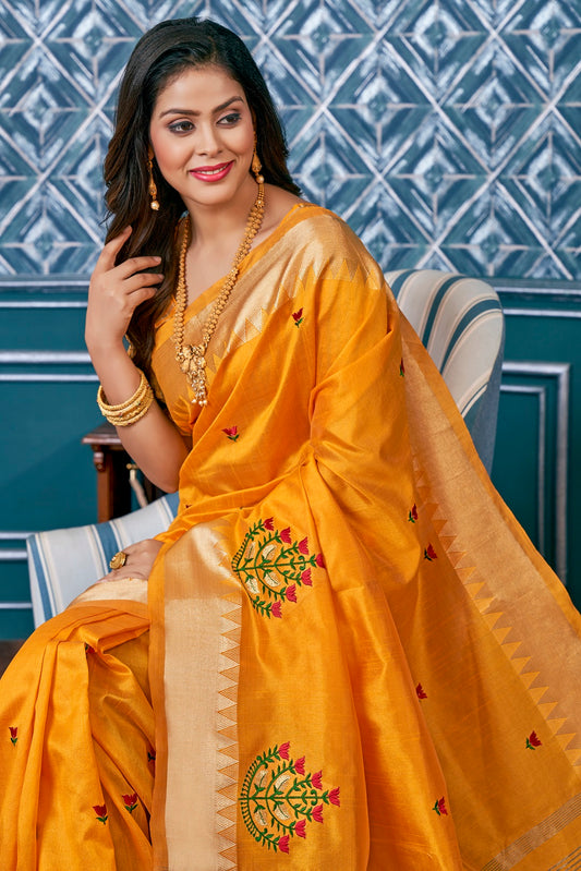 Dhiyona RV Women's Elegant Assam Cotton Silk Saree with Thread Embroidery & Golden Zari Border With Blouse ( KVD1894 )
