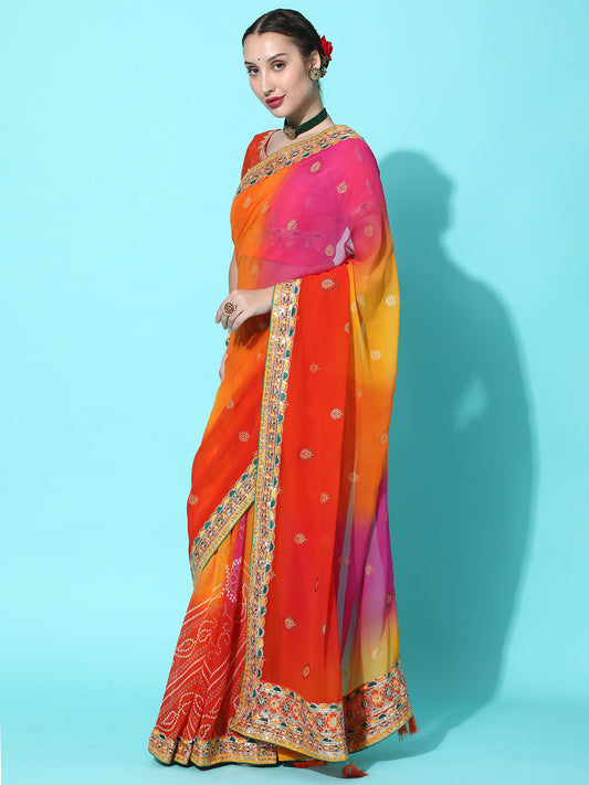 Dhiyona RV Women's Soft Pure Georgette With Bhandhani Print With Heavy Lace Saree With Blouse ( KVD2099 )