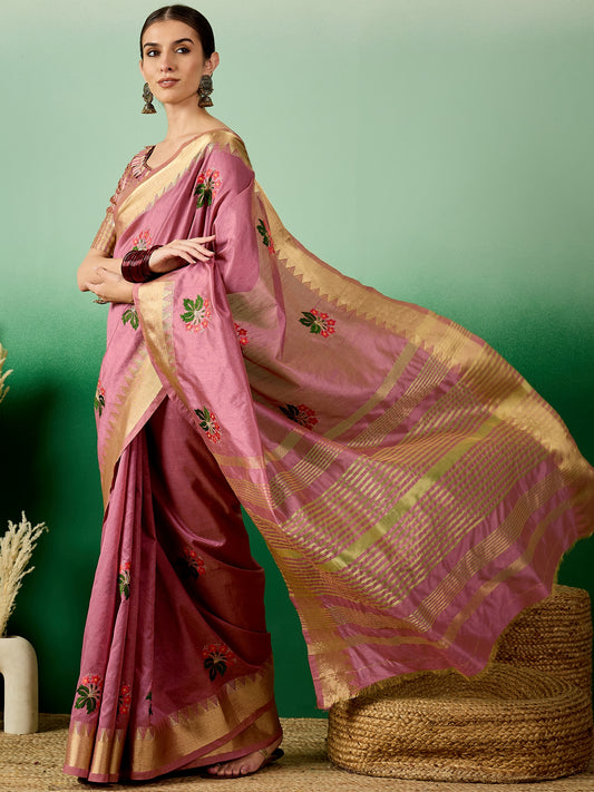 Dhiyona RV Women's Assam Cotton Silk Saree with Multi Thread Embroidery & Zari Temple Border With Blouse ( KVD2133 )