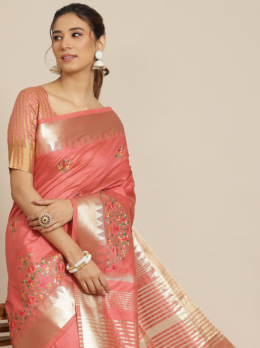 Dhiyona RV Women's Elegant Assam Cotton Silk Embroidered Saree with Temple Contrast Border ( KVD1698 )