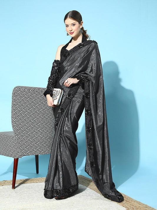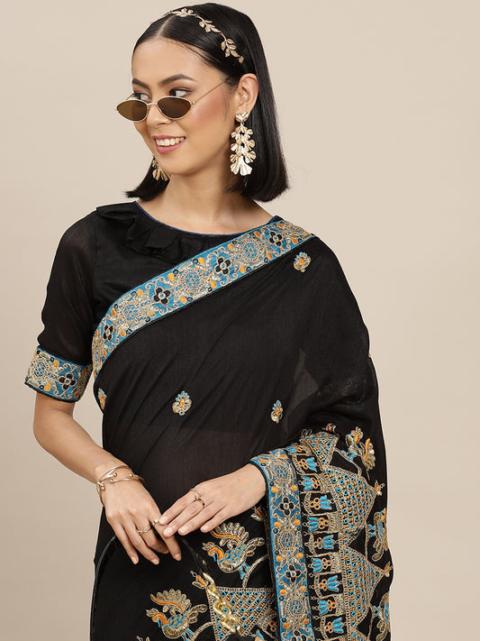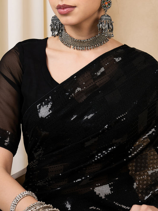 Dhiyona RV Women's Elegant Black Sequins Embroidered Georgette Saree with Matching Blouse ( KVD2110 )