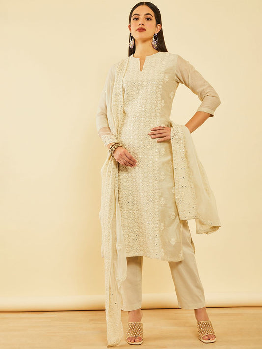Dhiyona SO Women's Beige Floral Embroidered Chanderi Silk Straight Kurta With Trousers & Dupatta