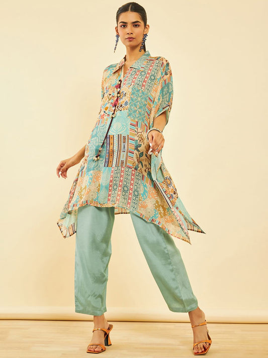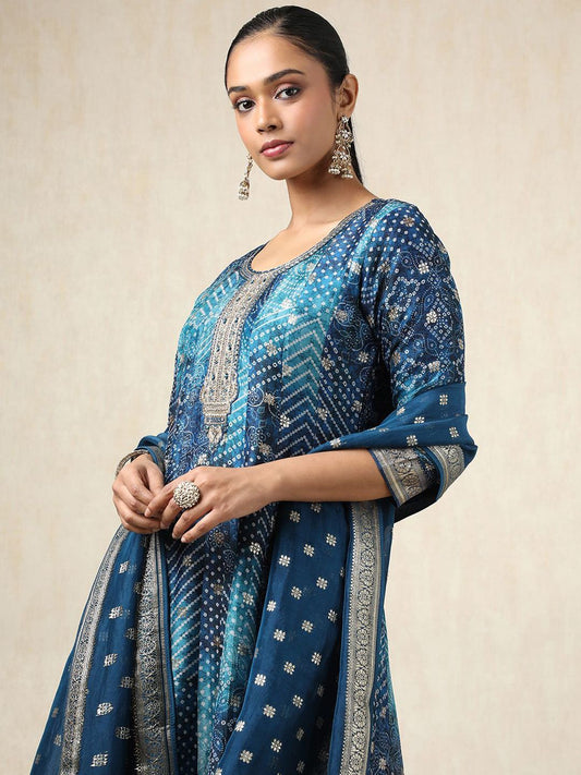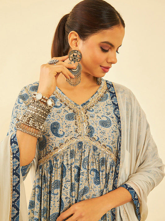 Dhiyona SO Women's Blue Paisley Printed Sequinned A-Line Kurta with Trousers & Dupatta
