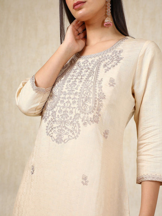 Dhiyona SO Women's Beige Paisley Embroidered Round Neck Regular Straight Kurta With Palazzo