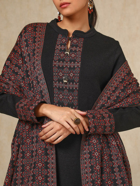 Dhiyona SO Women's Black Geometric Woven Design Layered Acrylic Straight Kurta With Trouser