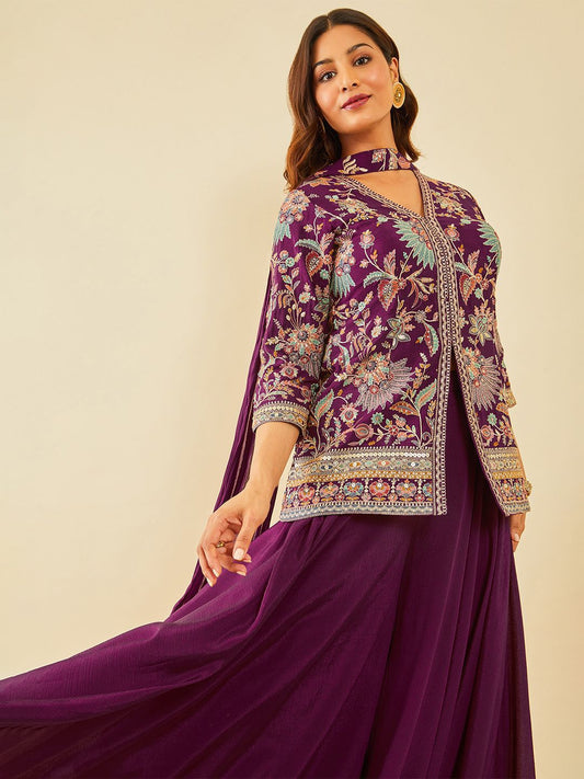 Dhiyona SO Women's Embroidered Sequinned Notch Neck Anarkali Kurta with Palazzos & Dupatta