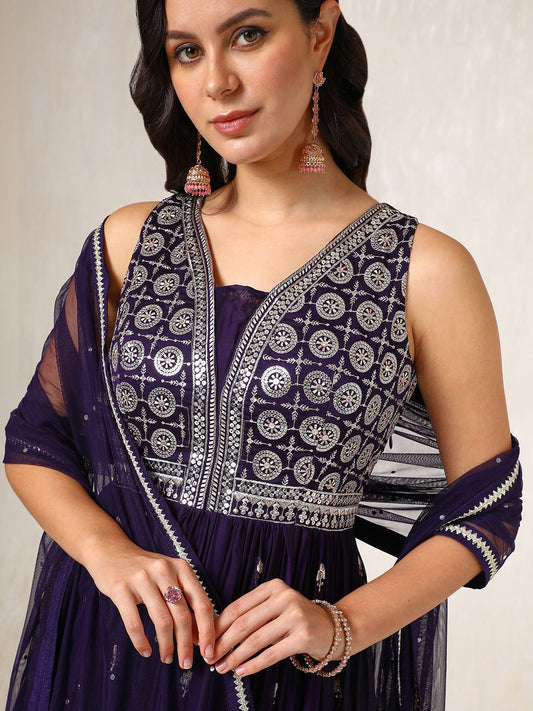 Dhiyona SO Women's Embroidered Georgette Anarkali Kurta with Churidar & with Dupatta