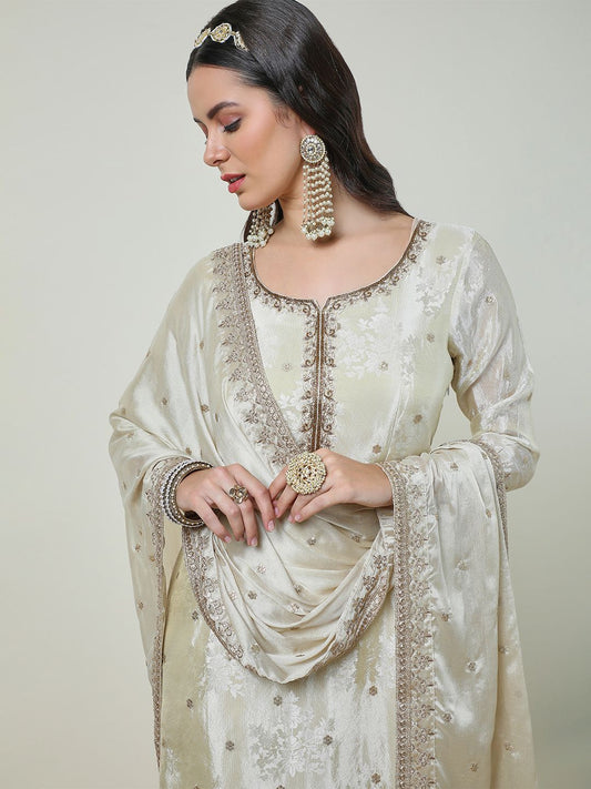 Dhiyona SO Women's Cream Floral Embroidered Notch Neck Zari Straight Kurta With Sharara & Dupatta