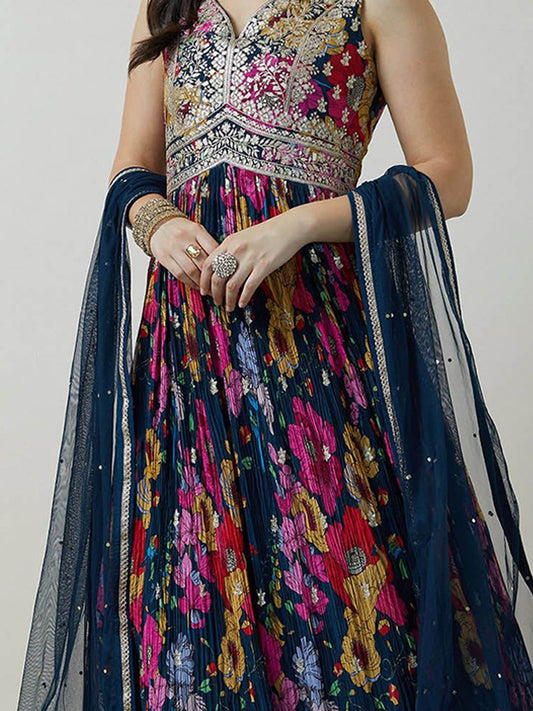 Dhiyona SO Women's Chinon Blend Botanical Print Gown With Sequins