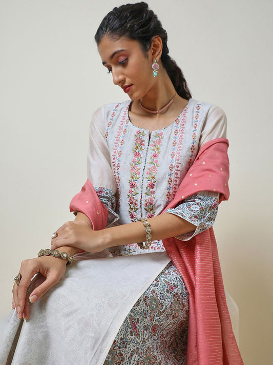 Dhiyona SO Women's Cream Floral Embroidered Thread Work Straight Kurta With Trousers & Dupatta
