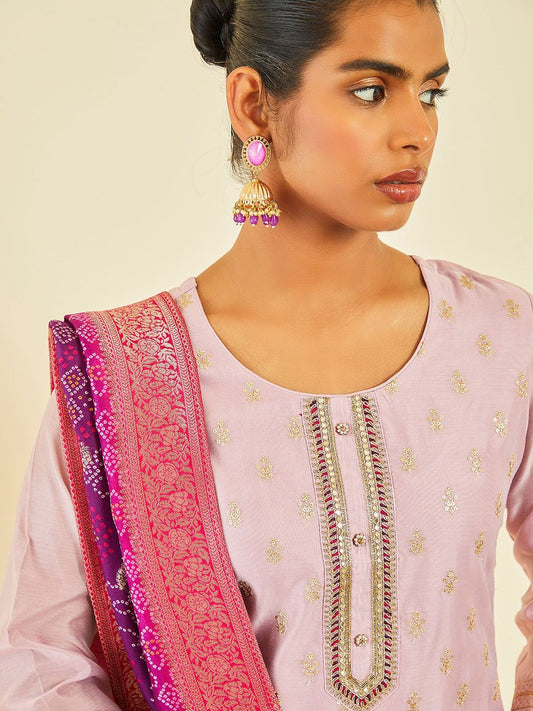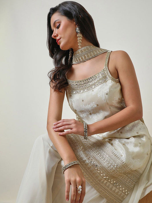 Dhiyona SO Women's Ethnic Motifs Embroidered Panelled Chanderi Silk Kurta with Palazzos & Dupatta
