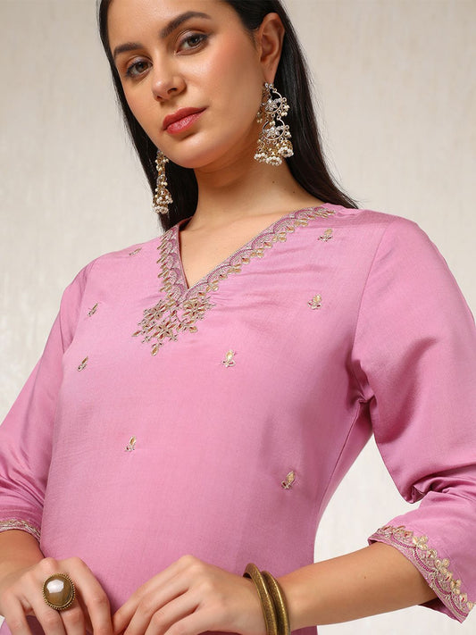 Dhiyona SO Women's Ethnic Motifs Embroidered Sequinned Detail Chanderi Silk Straight Kurta Set