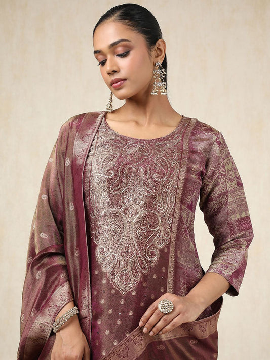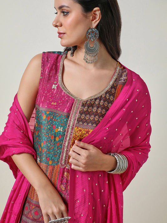 Dhiyona SO Women's Ethnic Motifs Printed Sequinned Chanderi Silk Kurta With Trousers & With Dupatta