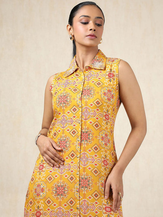 Dhiyona SO Women's Ethnic Motifs Printed Sleeveless Shirt Collar Straight Kurta With Palazzo