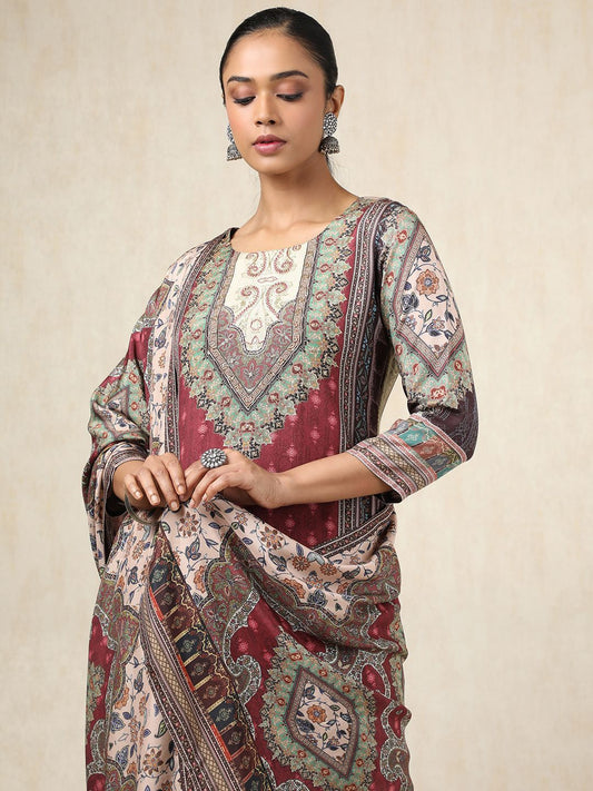 Dhiyona SO Women's Ethnic Motifs Printed Round Neck Straight Velvet Kurta With Trousers & Dupatta