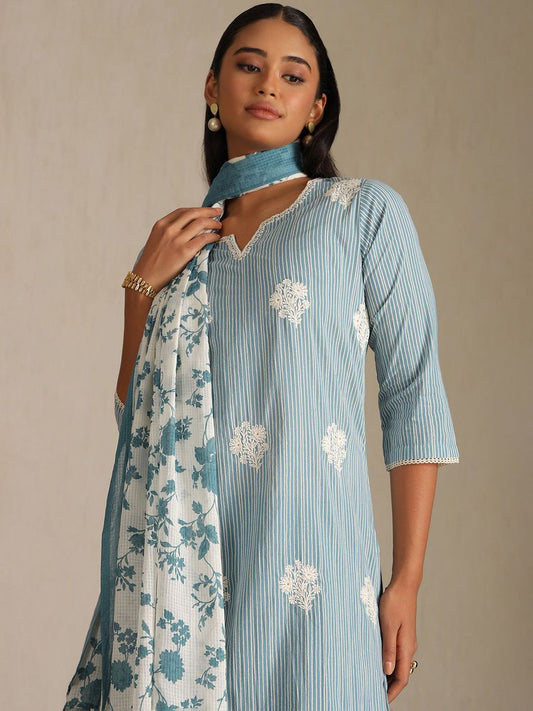 Dhiyona SO Women's Floral Embroidered Notch Neck Pure Cotton Straight Kurta With Trousers & Dupatta