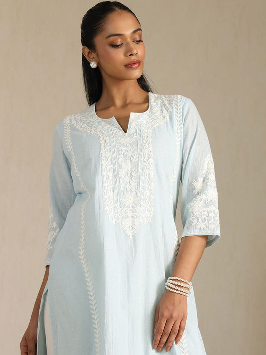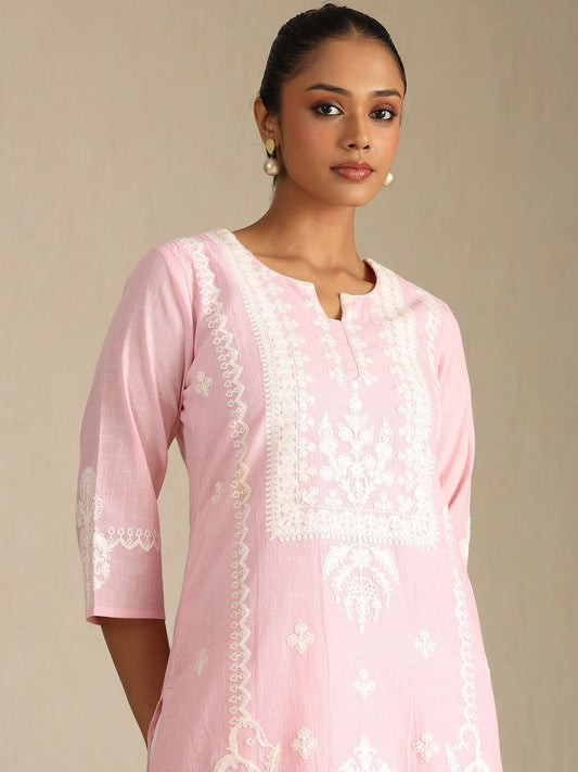 Dhiyona SO Women's Floral Embroidered Notch Neck Thread Work Pure Cotton Straight Kurta With Palazzos