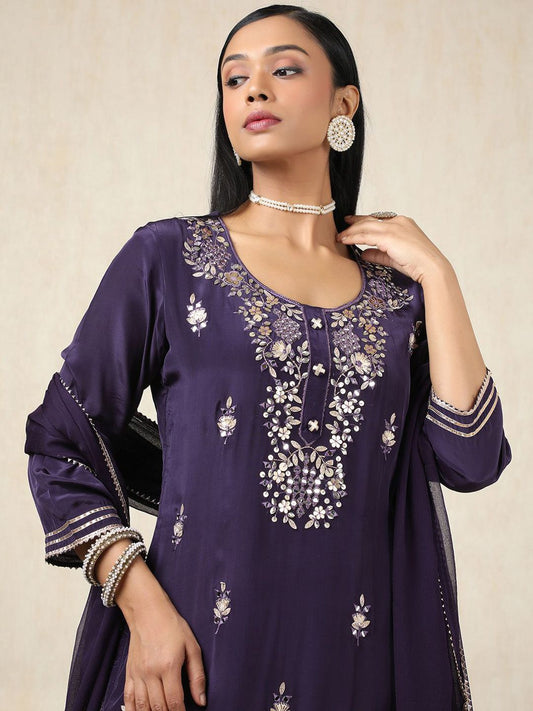Dhiyona SO Women's Floral Embroidered Notch Neck Sequinned Straight Kurta With Trousers & Dupatta