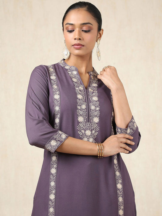 Dhiyona SO Women's Floral Embroidered Mandarin Collar Thread Work Straight Kurta With Trousers