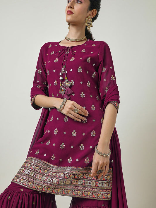 Dhiyona SO Women's Floral Embroidered Regular Sequinned Kurta with Sharara & Dupatta