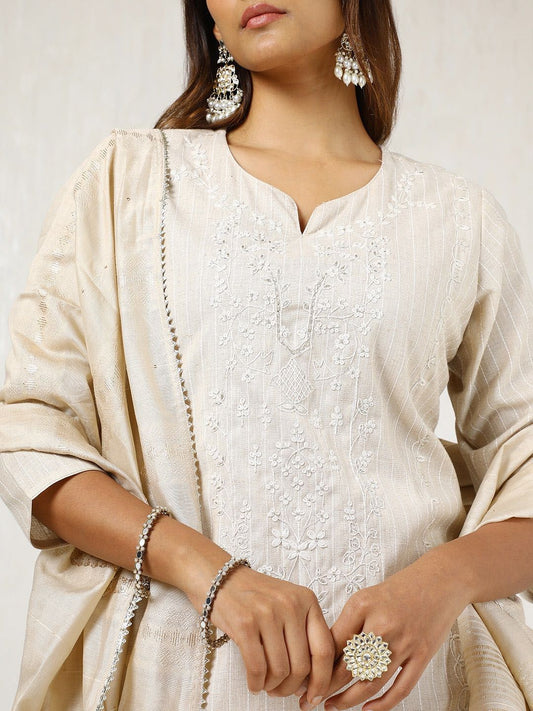 Dhiyona SO Women's Floral Embroidered Regular Thread Work Chanderi Silk Kurta With Trousers & Dupatta