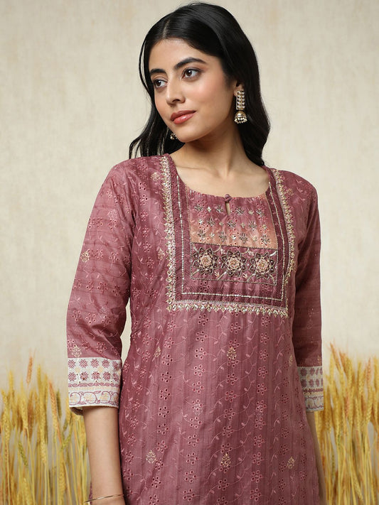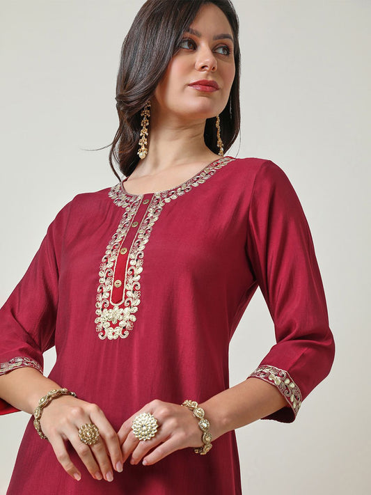 Dhiyona SO Women's Floral Embroidered Keyhole Neck Sequinned Chanderi Cotton Straight Kurta With Trouser