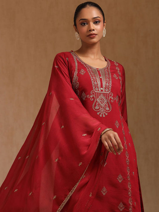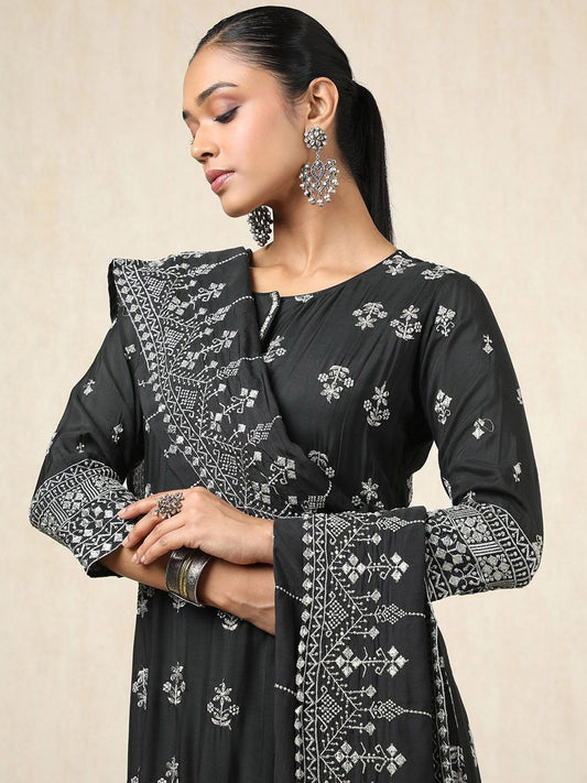 Dhiyona SO Women's Floral Embroidered Thread Work Chanderi Silk Straight Kurta With Palazzos And Dupatta