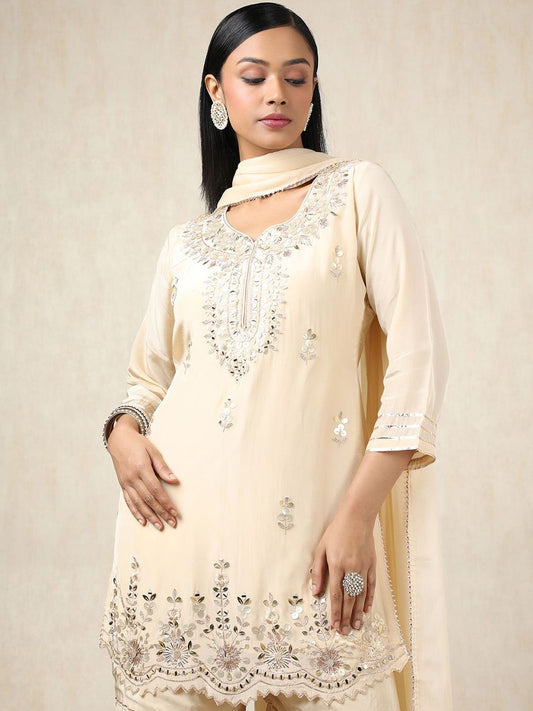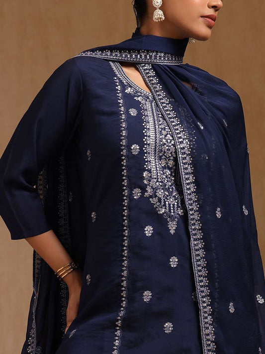 Dhiyona SO Women's Floral Embroidered Scoop Neck Sequinned Chanderi Cotton Kurta With Trousers & Dupatta